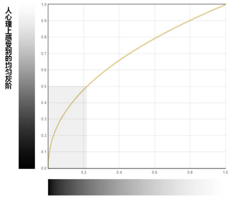 當物理亮度達到白色的20%左右的時候,人眼中已經感受到中灰色的概念。而剩下的一半高光區(qū)的灰階,需要用白色80%的物理亮度才能照亮成白色。
