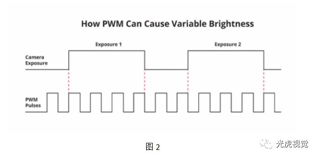 在PWM系統中,照明強度的準確性依賴于每次曝光有大量的電壓脈沖。高速的照明系統可能只有幾微秒的曝光時間,每次曝光只會出現幾個PWM脈沖。在這種高速照明系統中,PWM周期的不同會對照明強度產生可測量的影響。如圖2所示,相機曝光和PWM脈沖的時鐘導致相機第一次曝光比第二次曝光接收到超過30%的光。一個更快的內部PWM時鐘可以減少這種影響,但這些高速電壓脈沖會導致鄰近系統的EMC干擾。更先進的PWM系統可能提供同步PWM周期與相機快門的能力,但這可能很難實現,特別是滾動快門相機系統。