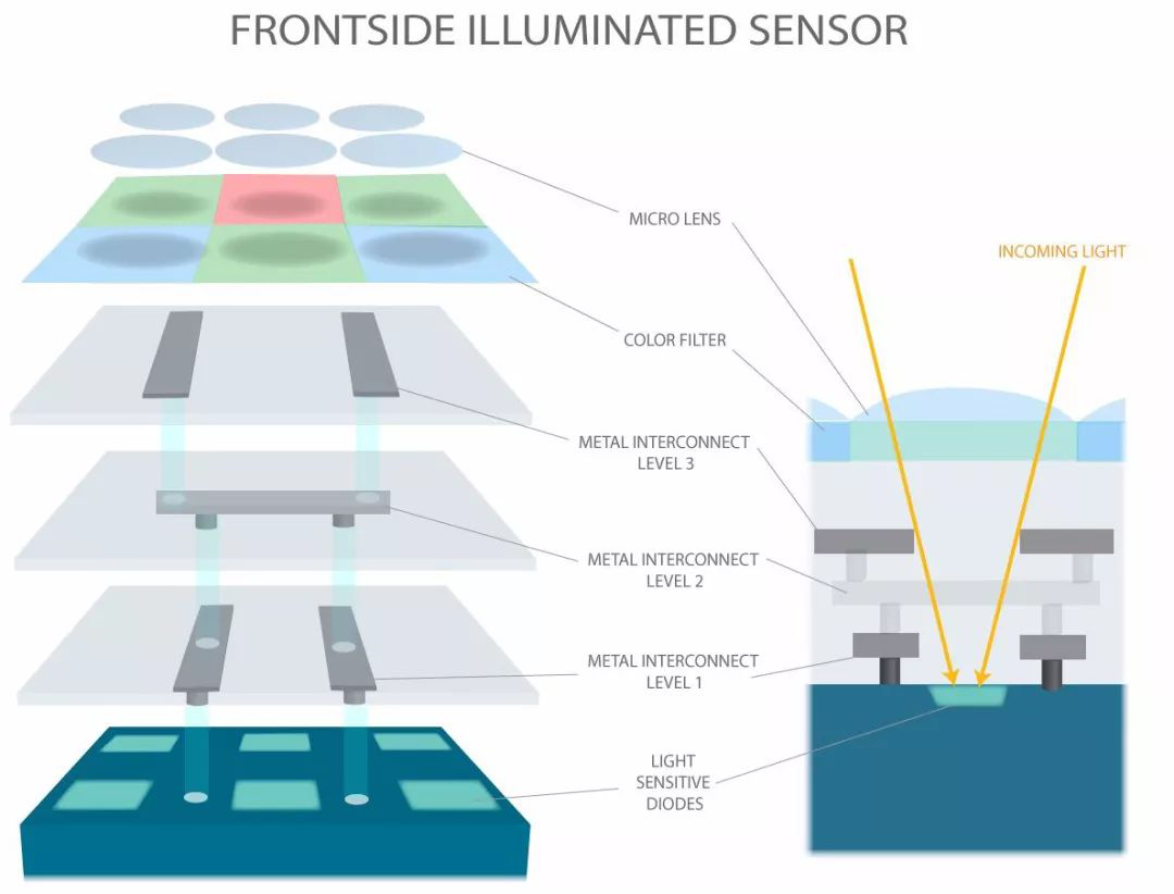 傳統的CMOS “前照式”結構,當光線射入像素,經過了片上透鏡和彩色濾光片后,先通過金屬排線層,最后光線才被光電二極管接收。